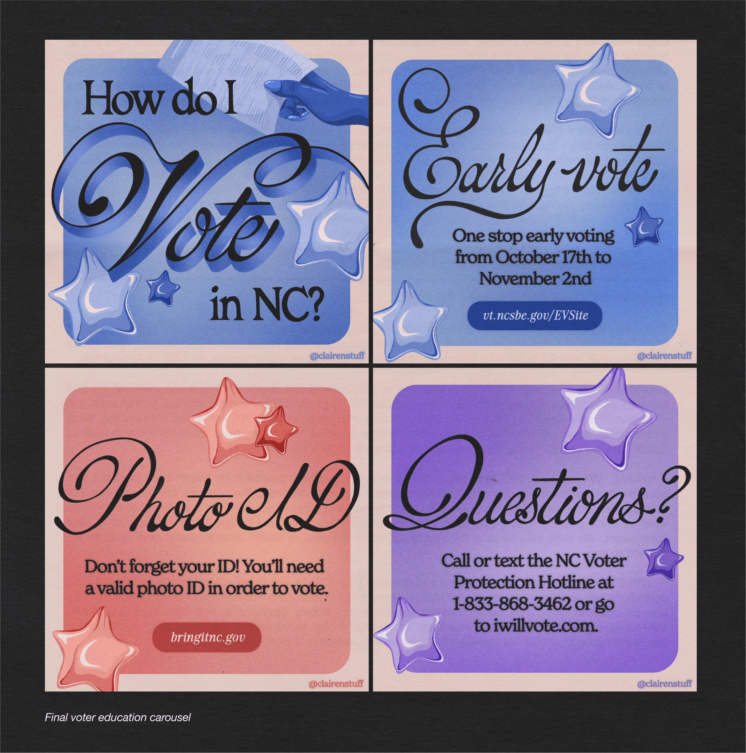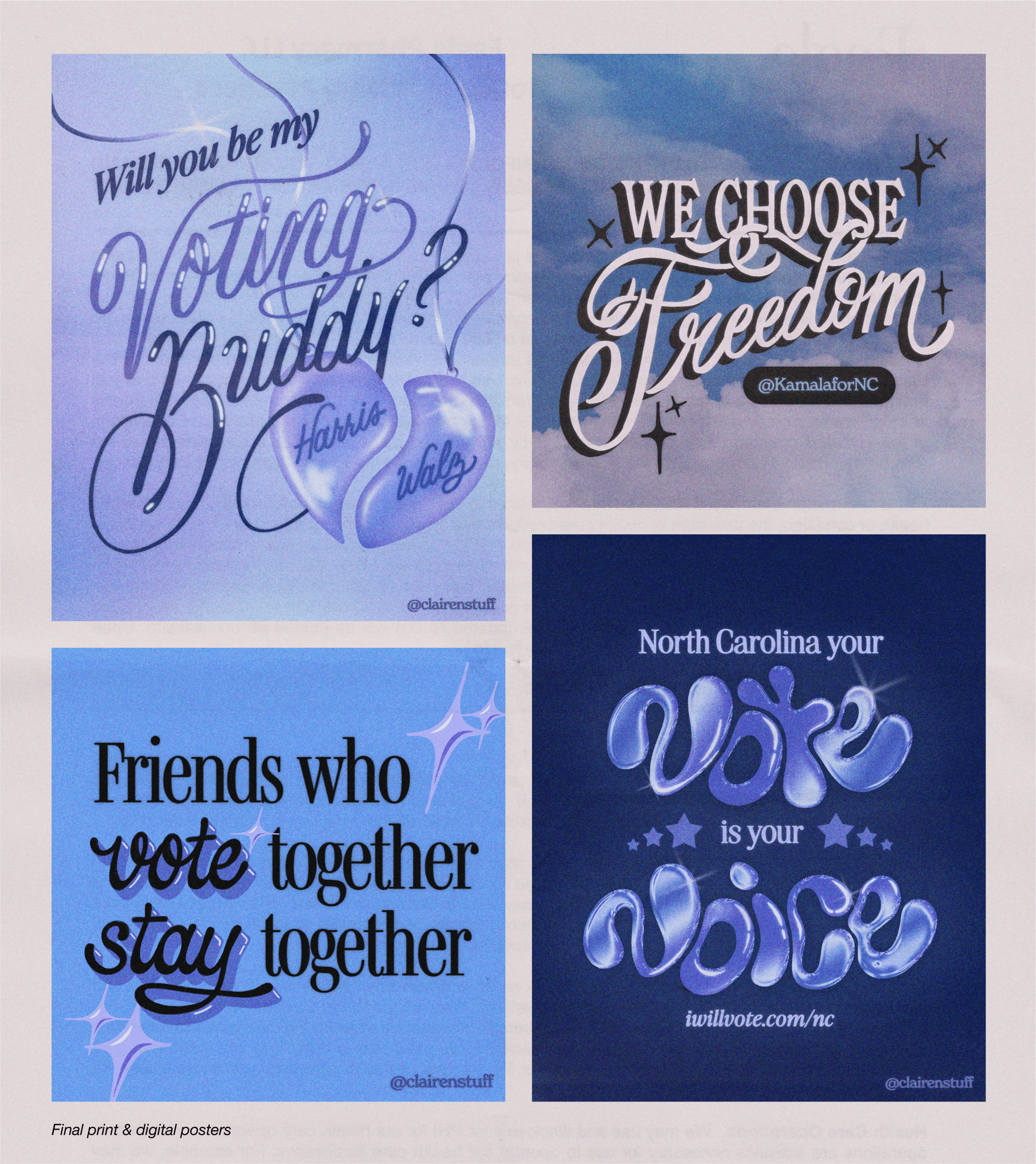 I intentionally created the pieces with versatility in mind, making sure it could be used across multiple platforms in both digital and print formats. The assets supported messaging and drove engagement on Kamala for NC's social channels, while also being shared on Reach to empower organizers and volunteers in other state-specific campaigns. Beyond digital, the materials were adapted for physical use—appearing as posters at rallies and as postcards for grassroots outreach efforts.