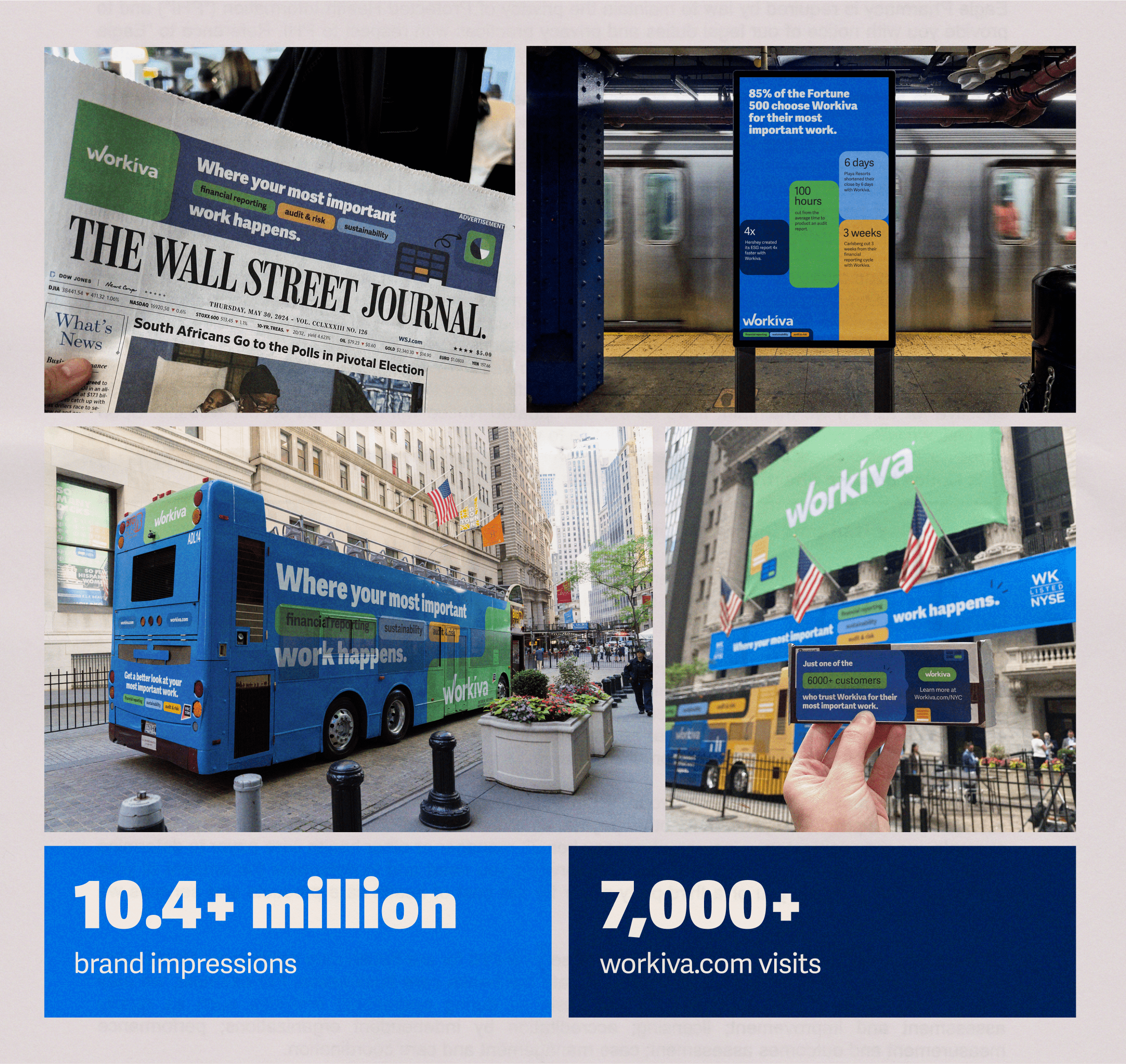 I expanded the campaign’s creative system to support high-impact moments like a 70-foot NYSE banner, a Times Square ad, a WSJ takeover, and a fully wrapped bus. By integrating our signature zesty green and thoughtfully expanding the use of abstracted platform illustrations, I established the building blocks for strong brand cohesion and recognition across OOH, digital, and print placements. Our efforts resulted in over 10.4 million impressions and over 7,000 visits to workiva.com, and ignited internal momentum to invest in our brand.